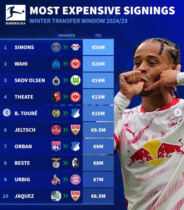 2月10日訊 五大聯(lián)賽冬窗已經(jīng)關(guān)閉,《轉(zhuǎn)會(huì)市場(chǎng)》也列出了德甲冬窗轉(zhuǎn)會(huì)費(fèi)最貴榜,哈維-西蒙斯居首。