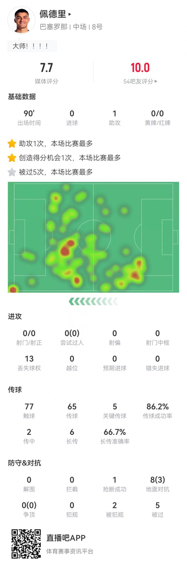 2月10日訊 巴薩在本輪西甲4-1擊敗塞維利亞,佩德里本場(chǎng)數(shù)據(jù)如下: