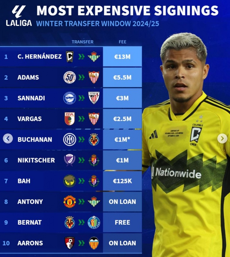 2月10日訊 五大聯(lián)賽冬窗已經(jīng)結(jié)束,《轉(zhuǎn)會市場》統(tǒng)計了西甲冬窗引援最貴榜單,貝蒂斯新援庫喬領(lǐng)銜。