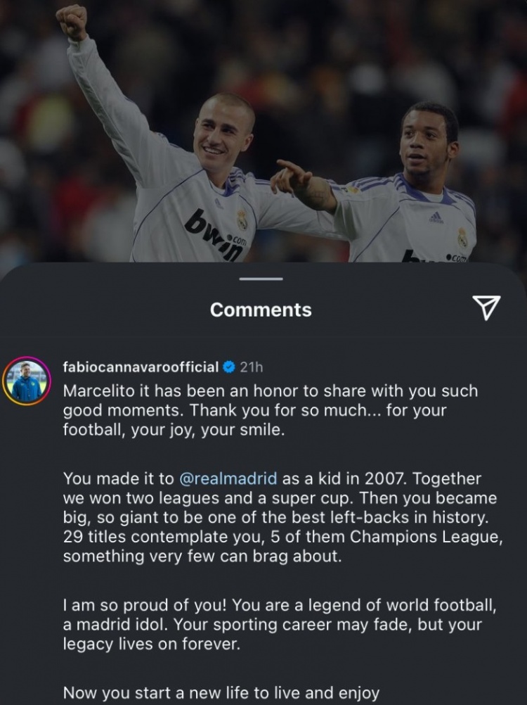 卡納瓦羅表示:“小馬塞洛,能榮幸能夠和你共享一段美好時(shí)光。非常感謝你的足球技術(shù)以及你的快樂感染力。你在2007年加盟皇馬時(shí)還是一個(gè)孩子,我們共同贏得了2座西甲和一座西超杯。而自那之后,你成長為了足壇歷史最佳左后衛(wèi)之一?!?/p>