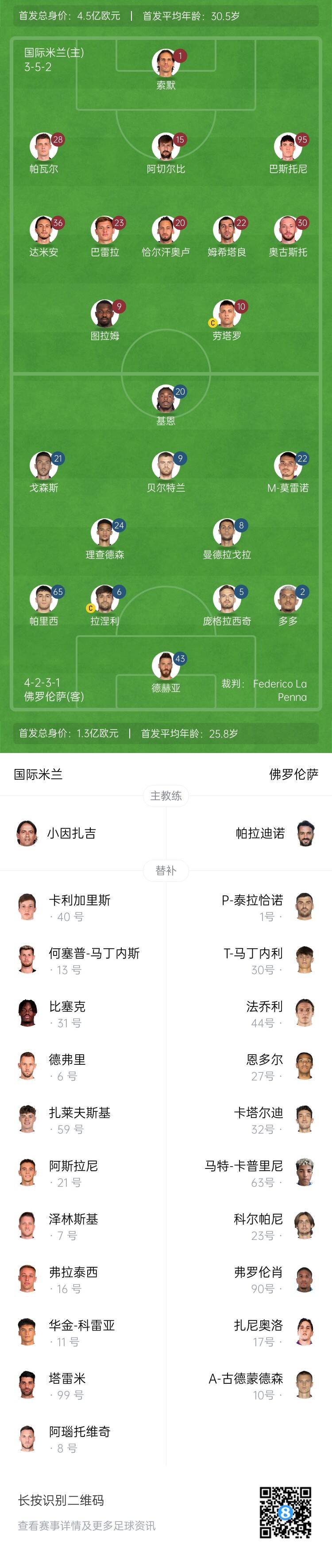 2月11日訊 意甲第24輪,國(guó)米主場(chǎng)對(duì)陣佛羅倫薩。賽前,官方公布了本場(chǎng)的首發(fā)名單。
