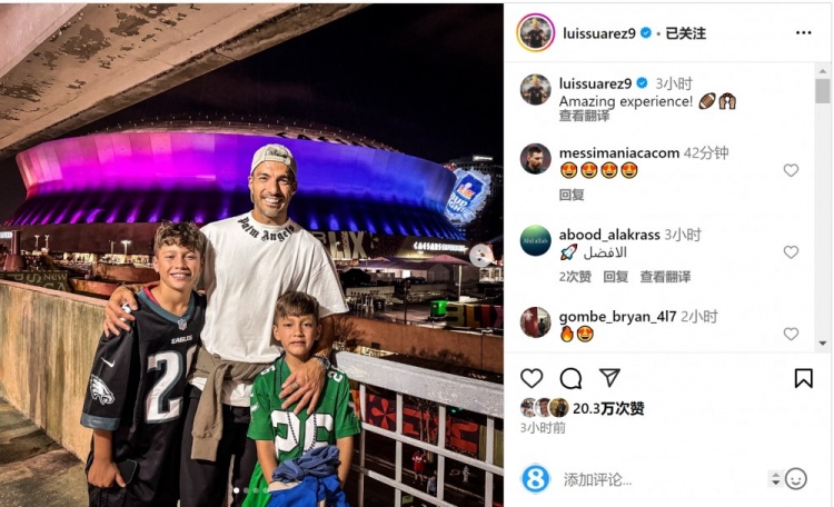 目前效力于邁阿密國際的蘇亞雷斯現(xiàn)場觀看了比賽,他在社交媒體上曬出與孩子在體育場外的合照,并配文:“很棒的體驗(yàn)?!?/p>