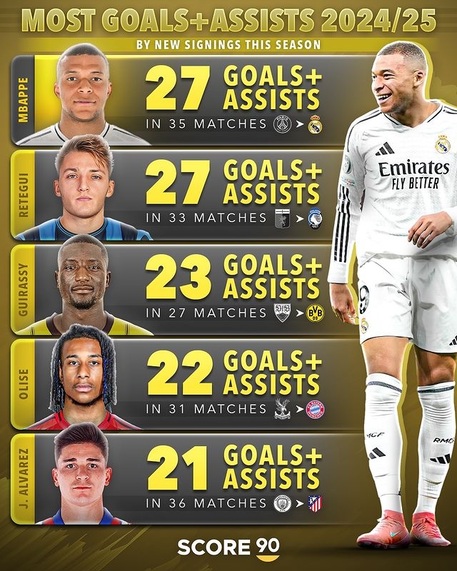 本賽季新援直接參與進(jìn)球(進(jìn)球+助攻)排行
