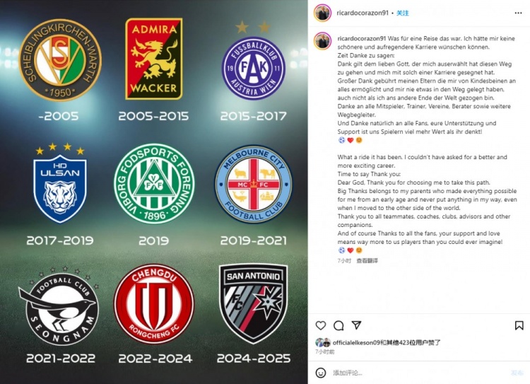 2月11日訊 前蓉城外援理查德在社媒宣布結(jié)束自己的職業(yè)生涯。