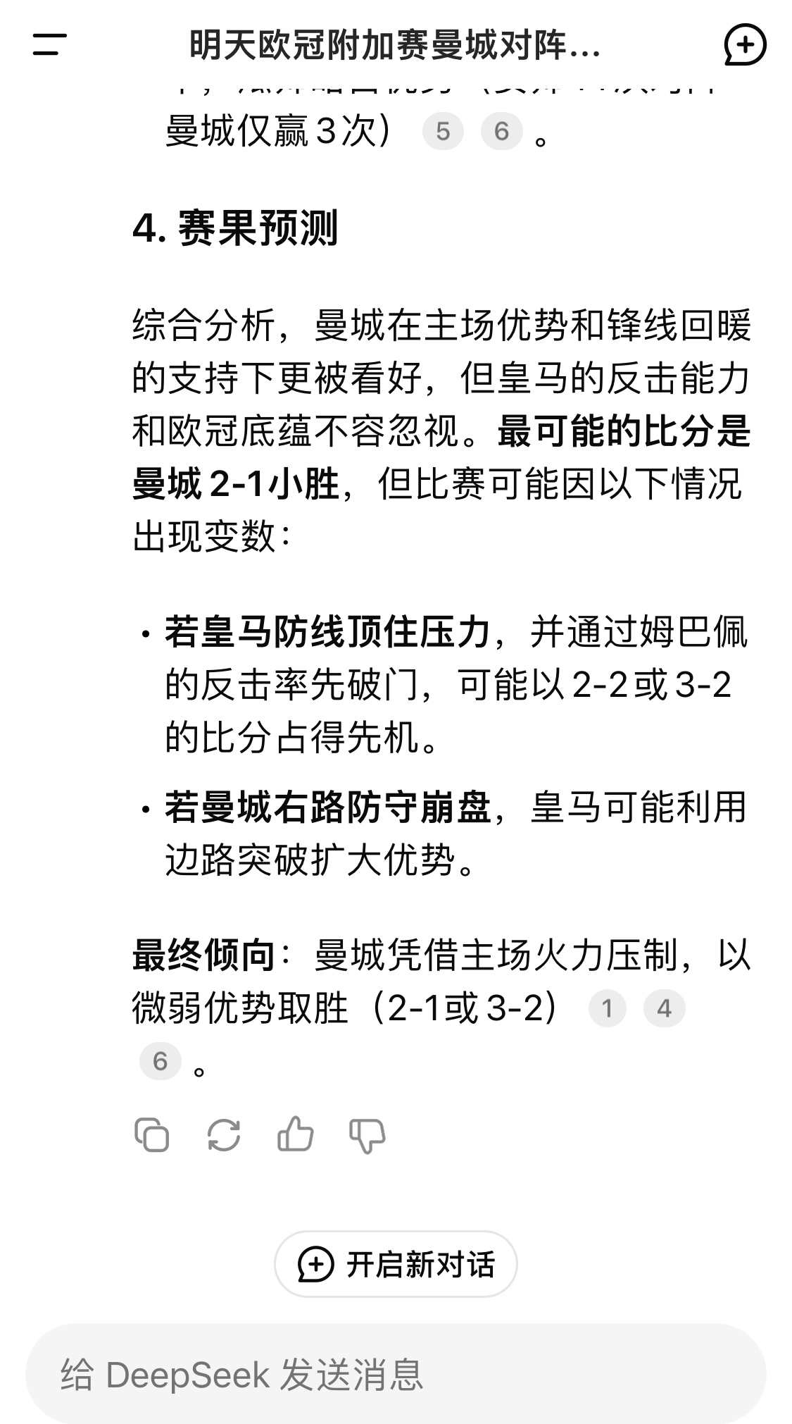 DeepSeek預(yù)測:曼城以微弱優(yōu)勢取勝,最可能的比分是曼城2-1皇馬
