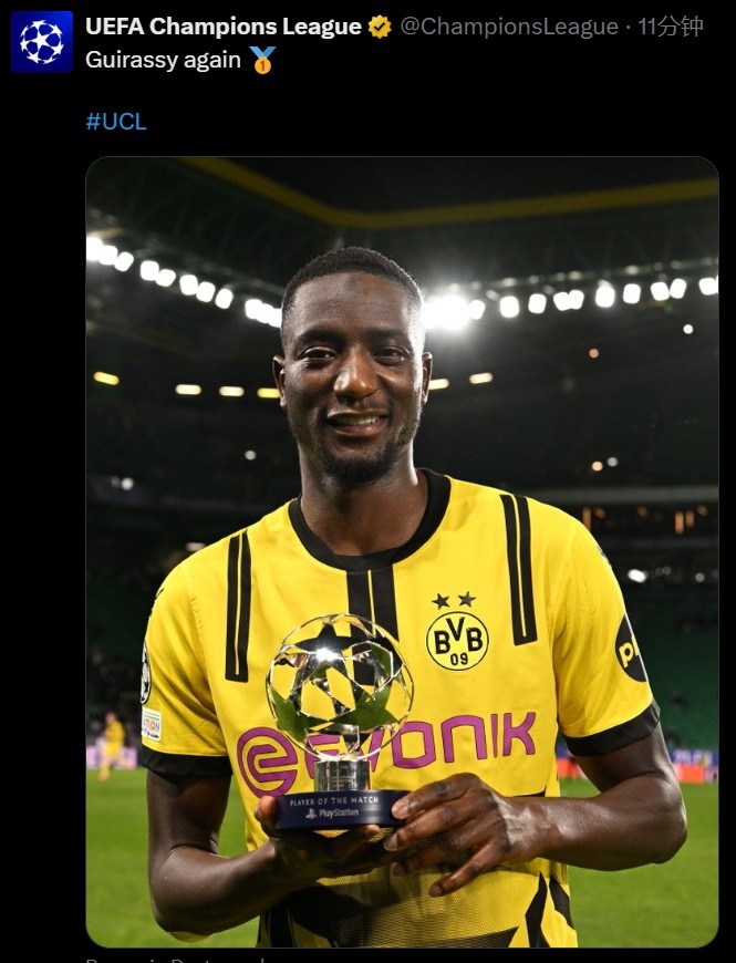 歐冠官方也在賽后將吉拉西評為本場比賽的最佳球員。