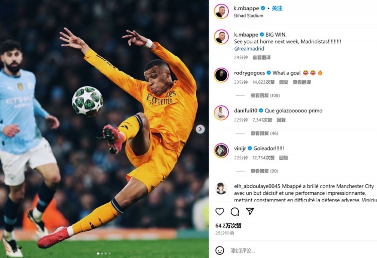 姆巴佩也在賽后通過社媒曬出自己射門瞬間的比賽照,并配文:“重要的勝利!下周主場(chǎng)再見,馬德里主義者們?。。。?!@皇馬俱樂部”。