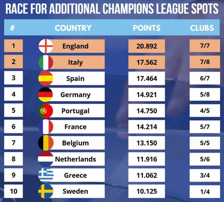 注:根據(jù)歐戰(zhàn)新規(guī),最終歐戰(zhàn)積分前二的聯(lián)賽將在下賽季各獲得一個(gè)額外的歐冠參賽席位。