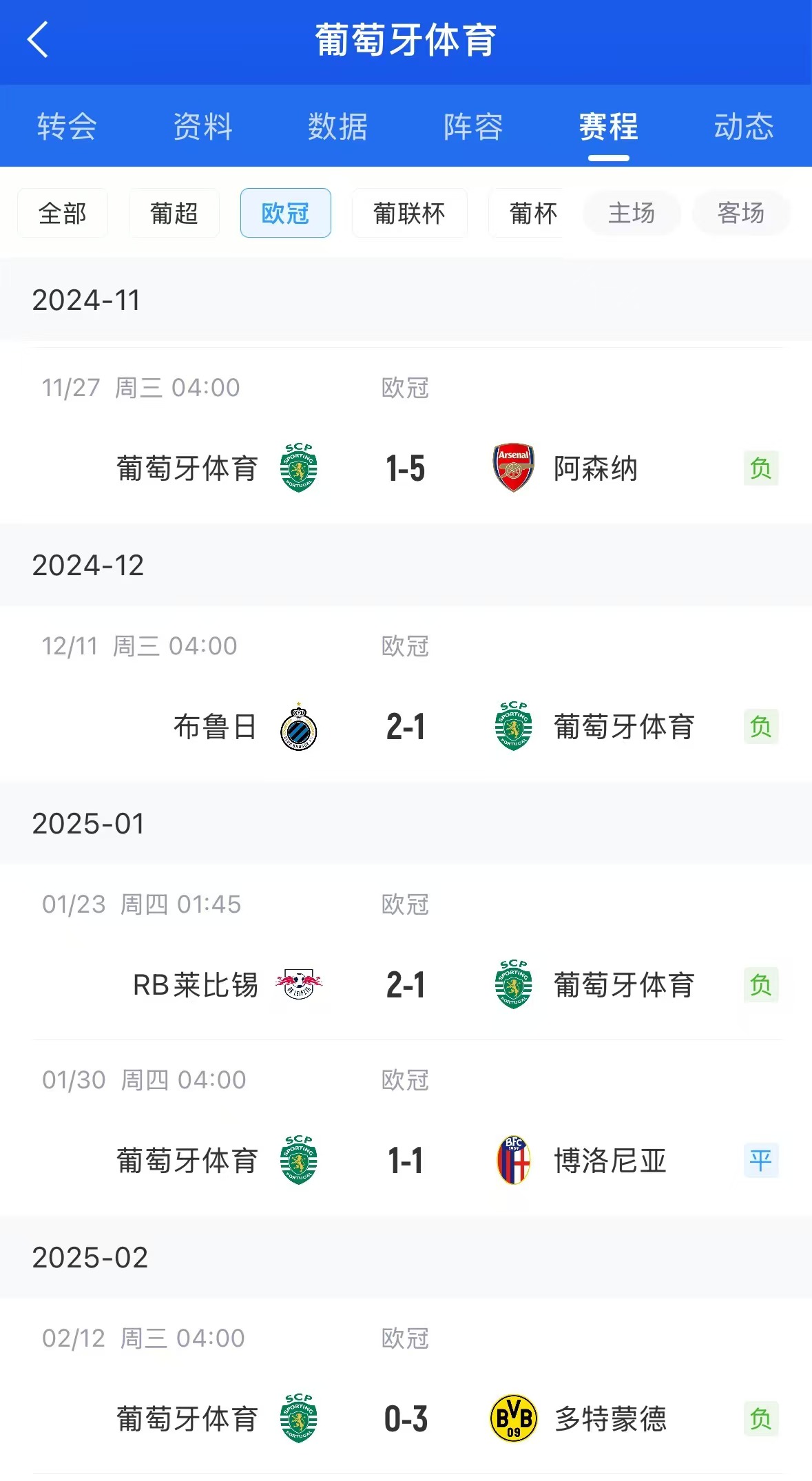 02月12日訊 歐冠淘汰賽附加賽首回合,葡萄牙體育主場(chǎng)0-3不敵多特。球隊(duì)在阿莫林離任后,5場(chǎng)歐冠比賽1平4負(fù)未嘗一勝。