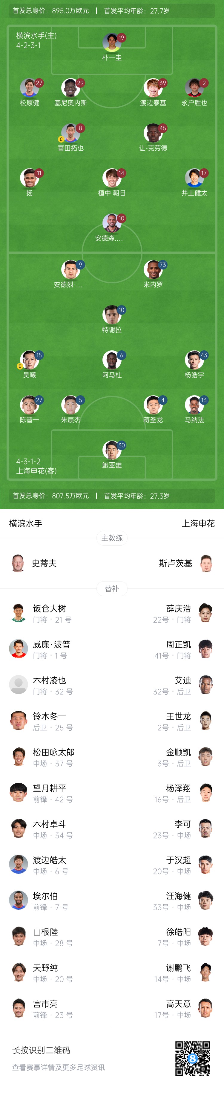上海申花替補(bǔ):22-薛慶浩、41-周正凱、2-王世龍、3-金順凱、16-楊澤翔、32-艾迪、7-徐皓陽、14-謝鵬飛、17-高天意、20-于漢超、23-李可、33-汪海健