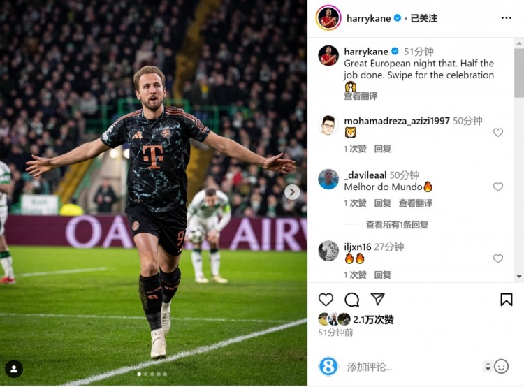 凱恩賽后在社交媒體上曬出慶祝進(jìn)球的照片,配文:“美妙的歐冠之夜,任務(wù)完成了一半,滑動(dòng)屏幕看我的慶祝?!?/p>