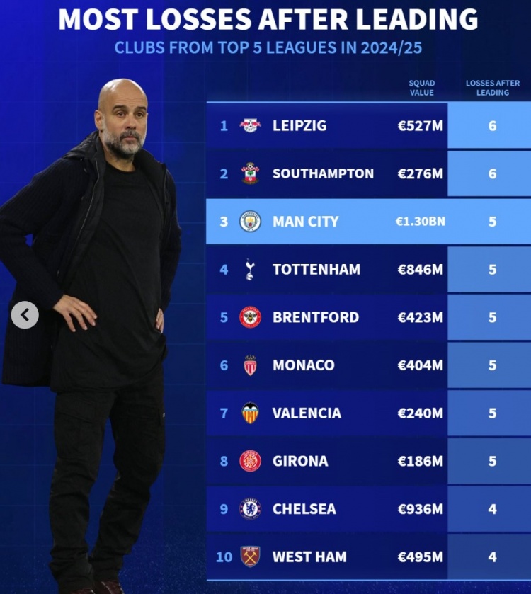 本賽季被逆轉(zhuǎn)次數(shù)榜:萊比錫&圣徒6次,曼城&熱刺5次、切爾西4次