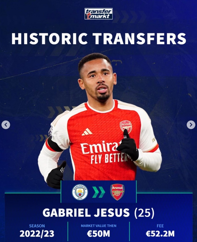 熱蘇斯(曼城→阿森納):22-23賽季,25歲,身價5000萬歐,轉(zhuǎn)會費5220萬歐