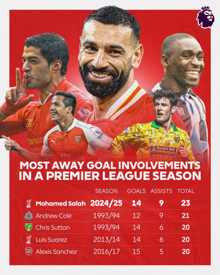 曇花億現(xiàn)!薩拉赫本賽季英超客場(chǎng)已直接參與23球,刷新賽事紀(jì)錄