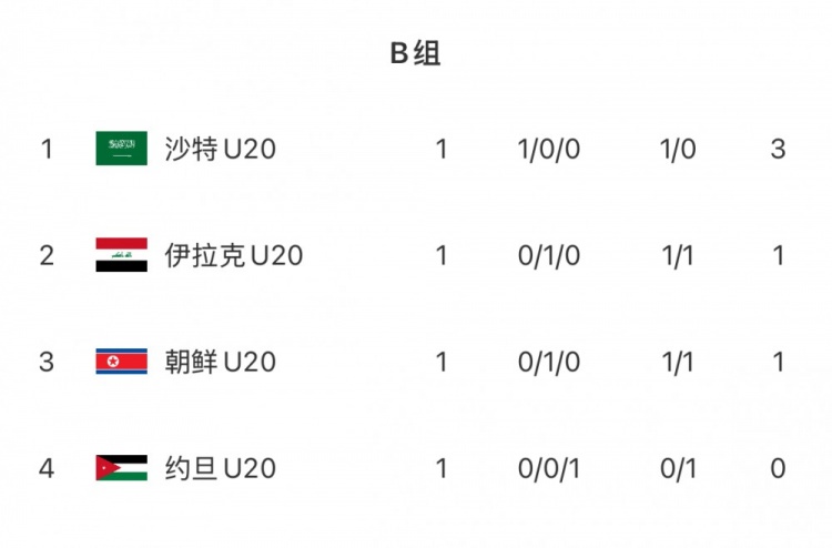 積分榜上,沙特3分領(lǐng)跑,伊拉克與朝鮮積1分,約旦0分墊底。第二輪賽事,沙特對陣伊拉克,朝鮮對陣約旦。
