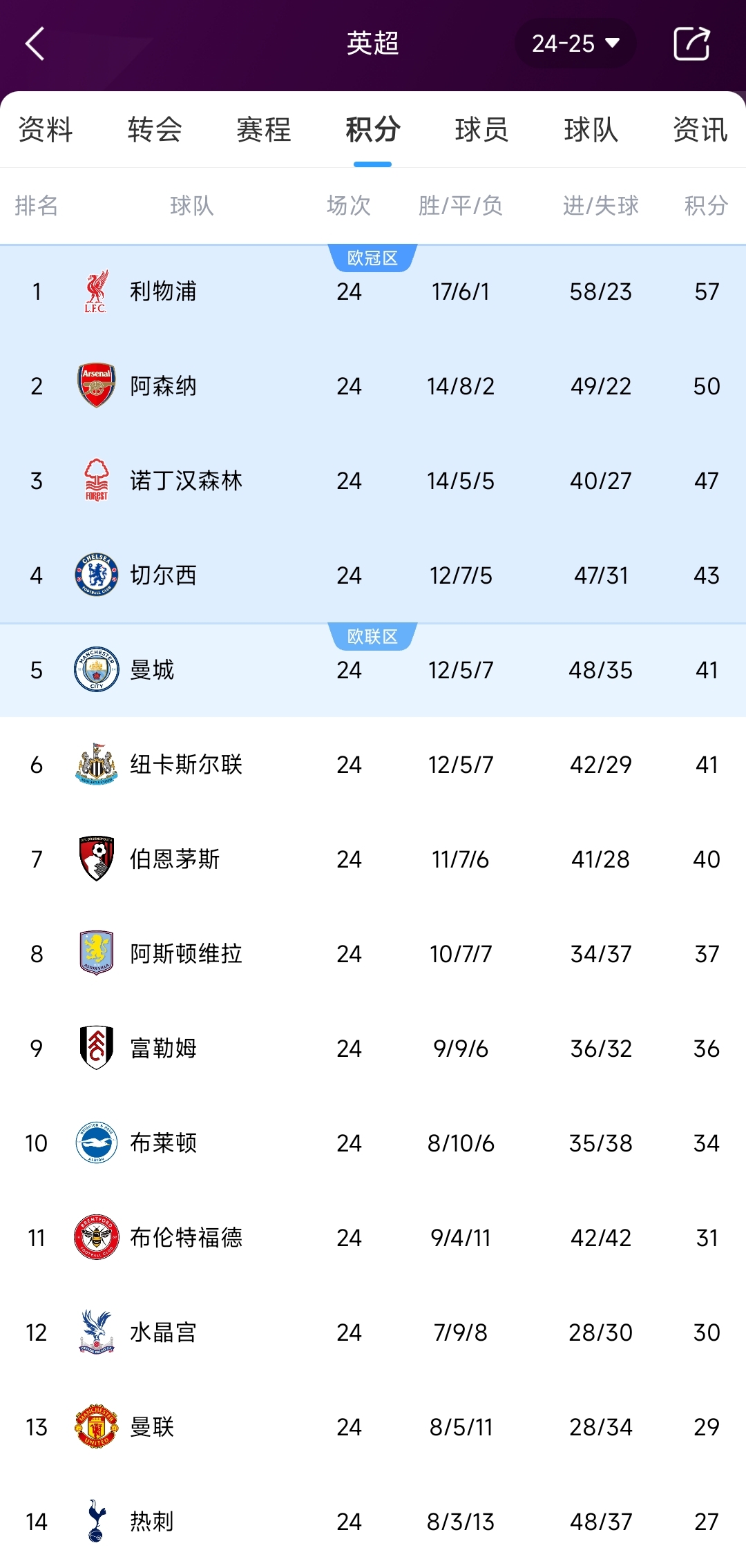 本賽季英超積分榜