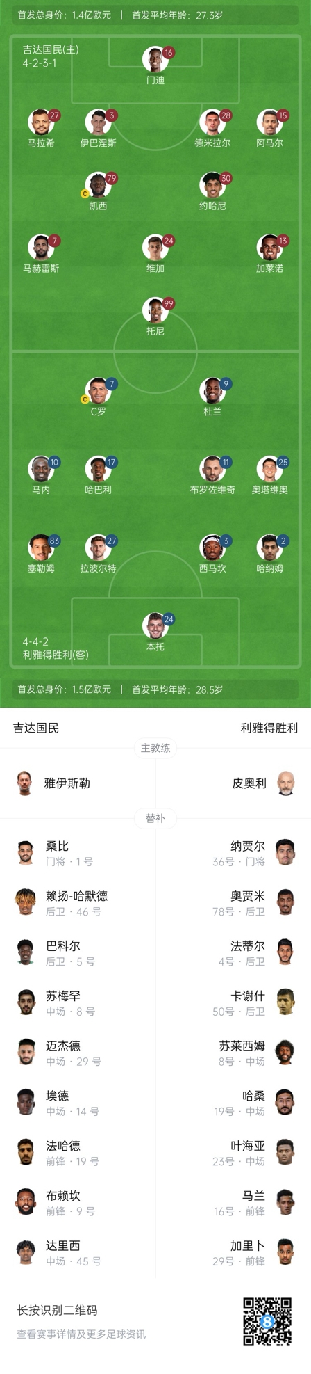 吉達(dá)國民首發(fā):16-愛德華-門迪、27-馬加希斯、3-伊巴涅斯、28-德米拉爾、15-阿馬爾、79-凱西、30-約哈尼、7-馬赫雷斯、24-加布里-維加、13-加萊諾、99-伊萬-托尼
