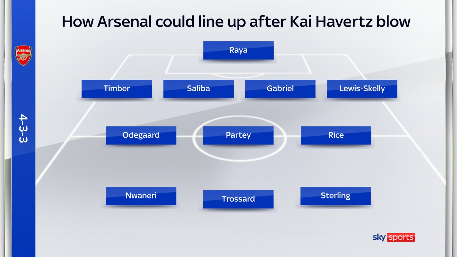 哈弗茨受傷賽季報(bào)銷(xiāo)后,天空體育列出了阿森納可能的首發(fā)陣容: