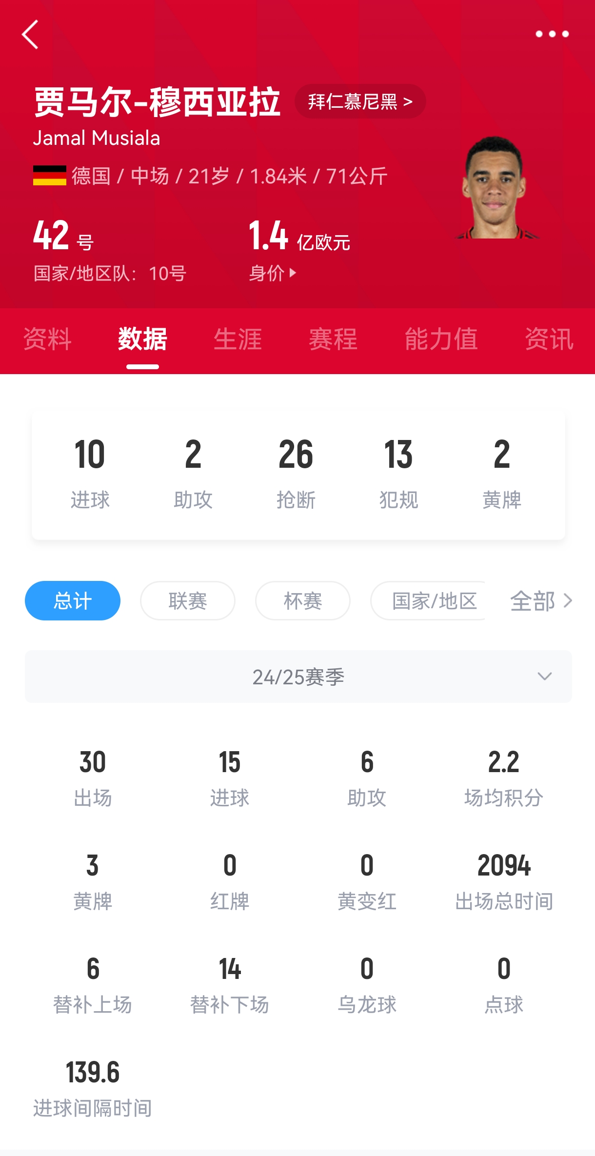 穆西亞拉現(xiàn)年21歲,德國(guó)籍攻擊性中場(chǎng)。他青少年時(shí)期曾在切爾西梯隊(duì)接受訓(xùn)練,2019年他轉(zhuǎn)投拜仁青訓(xùn)。2020年夏天穆西亞拉正式進(jìn)入拜仁一線隊(duì),至今已經(jīng)代表球隊(duì)出戰(zhàn)193場(chǎng),貢獻(xiàn)58球38助。在國(guó)家隊(duì)層面,穆西亞拉已經(jīng)代表德國(guó)成年隊(duì)出戰(zhàn)38場(chǎng)打進(jìn)7球。穆西亞拉現(xiàn)如今的德轉(zhuǎn)身價(jià)已達(dá)到1.4億歐元。