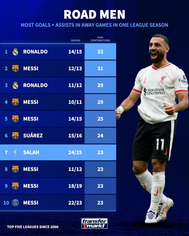 2月15日訊 德轉統(tǒng)計了2000年后在單賽季聯(lián)賽客場比賽中制造進球榜單,本賽季的薩拉赫已經(jīng)制造了23球,距離C羅保持的紀錄還差9球。