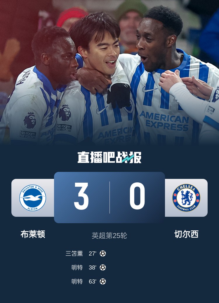 英超第25輪,切爾西客場(chǎng)0-3布萊頓。上半場(chǎng),三笘薰完美停球兜射破門,明特再下一城;下半場(chǎng),明特再入一球完成雙響。