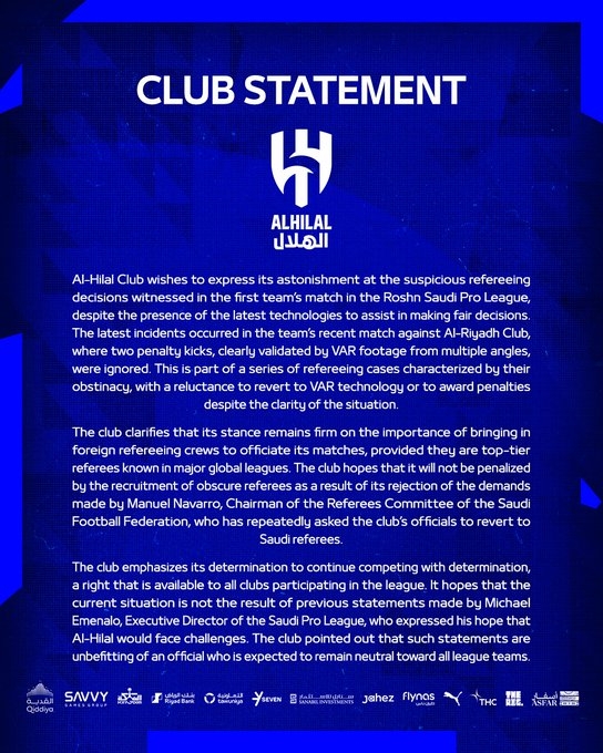 俱樂部的立場(chǎng)仍然堅(jiān)定,即引進(jìn)外國裁判人員來執(zhí)行比賽的重要性,前提是他們是在全球主要聯(lián)賽中知名的頂級(jí)裁判。俱樂部希望不會(huì)因?yàn)榫芙^了沙特足協(xié)裁判委員會(huì)主席曼努埃爾-納瓦羅的要求而受到不知名裁判執(zhí)法比賽的懲罰。納瓦羅曾多次要求俱樂部官員恢復(fù)使用沙特裁判,但俱樂部強(qiáng)調(diào)了其決心,這是所有參加聯(lián)賽的俱樂部都享有的權(quán)利。