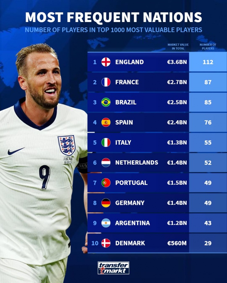 2月16日訊 德國轉(zhuǎn)會市場統(tǒng)計了身價前1000名各國球員的人數(shù),并列出榜單,英格蘭112人居首,法國、巴西二三位。